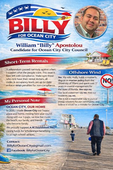 Paid for by William "Billy" Apostolou, Candidate for City Council - Gull Way, Ocean City, MD 21842